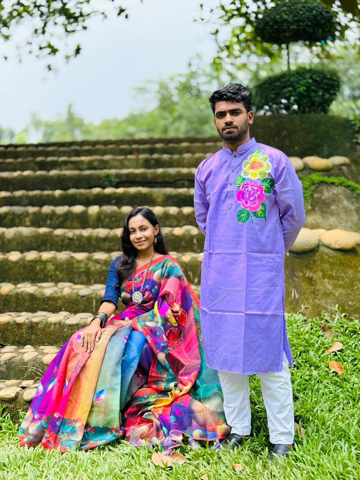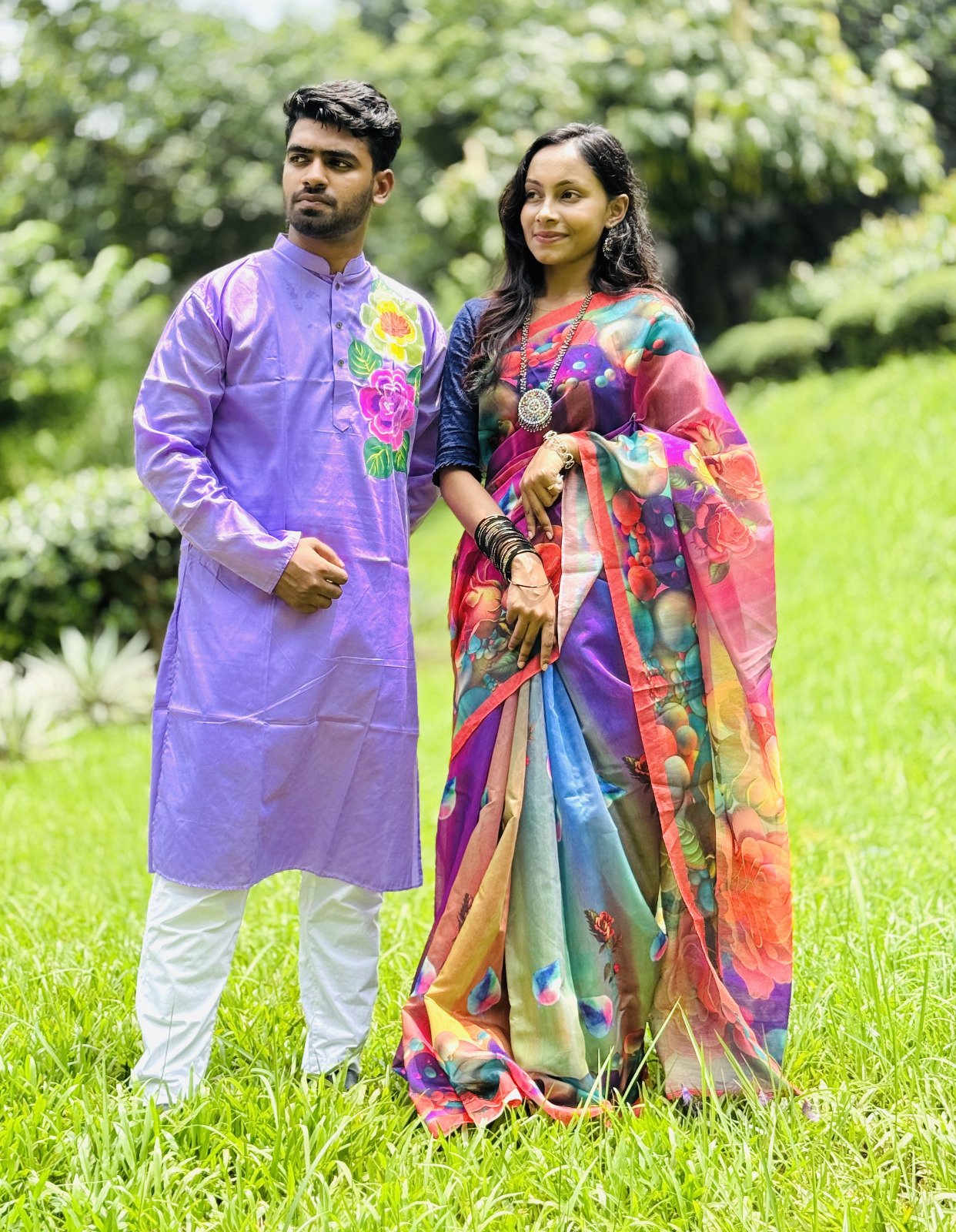 ✨ চান্দুরি সিল্ক শাড়ির নরম সৌন্দর্য আর ধুপিয়ান সিল্ক পাঞ্জাবির স্টাইলিশ ছোঁয়ায় ফুটে উঠুক ভালোবাসার রঙ—