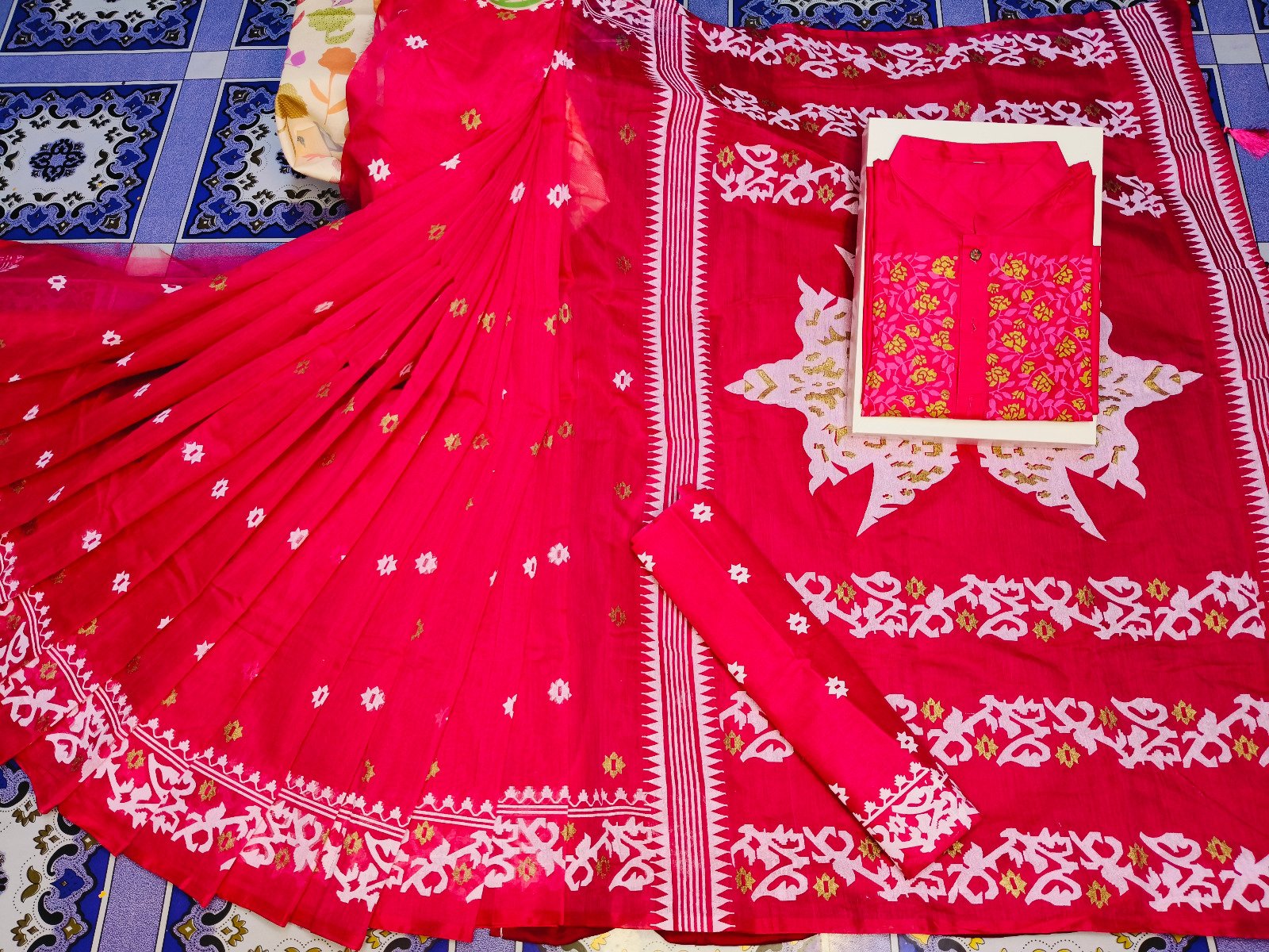 🌸 শাড়ি: প্রিমিয়াম হাফসিল্ক, স্কিন প্রিন্টের কাজ সহ, সাথে ব্লাউজ পিস