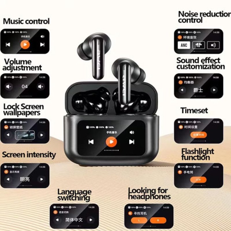 Control everything without touching your phone. The charging case’s built-in touchscreen allows you to manage ANC, volume, music playback, timer, battery status, wallpapers, and brightness settings with ease.