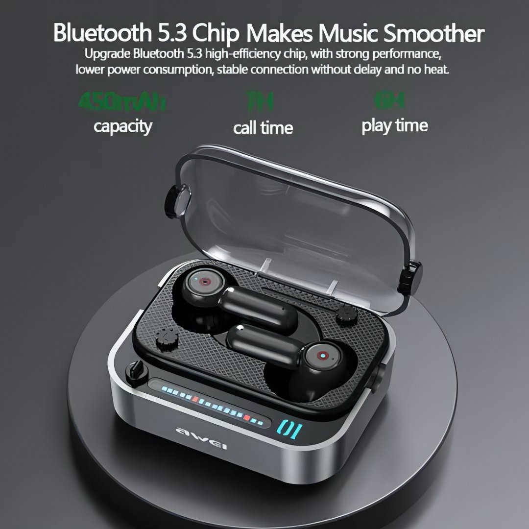 Awei T58 TWS Bluetooth 5.3 ইয়ারবাডস – স্টাইলিশ ট্রান্সপারেন্ট কভার ও ব্লু LED অ্যাম্বিয়েন্ট লাইট সহ হালকা ওজনের ইয়ারবাড। এতে আছে 13mm ড্রাইভার, ফ্রিকোয়েন্সি রেঞ্জ 20Hz‑20kHz, সেনসিটিভিটি 100±3dB, এবং পরিষ্কার সাউন্ড। ৬ ঘণ্টা মিউজিক প্লে, ৭ ঘণ্টা টক টাইম, আর ৩০০ ঘণ্টা স্ট্যান্ডবাই সুবিধা পাবেন। দ্রুত Type‑C চার্জিং (১.৫ ঘণ্টায় ফুল চার্জ), IPX6 ওয়াটারপ্রুফ রেটিং এবং টাচ কন্ট্রোল, ভয়েস অ্যাসিস্ট্যান্ট সাপোর্টসহ মিউজিক, কল ও দৈনন্দিন ব্যবহারের জন্য পারফেক্ট।