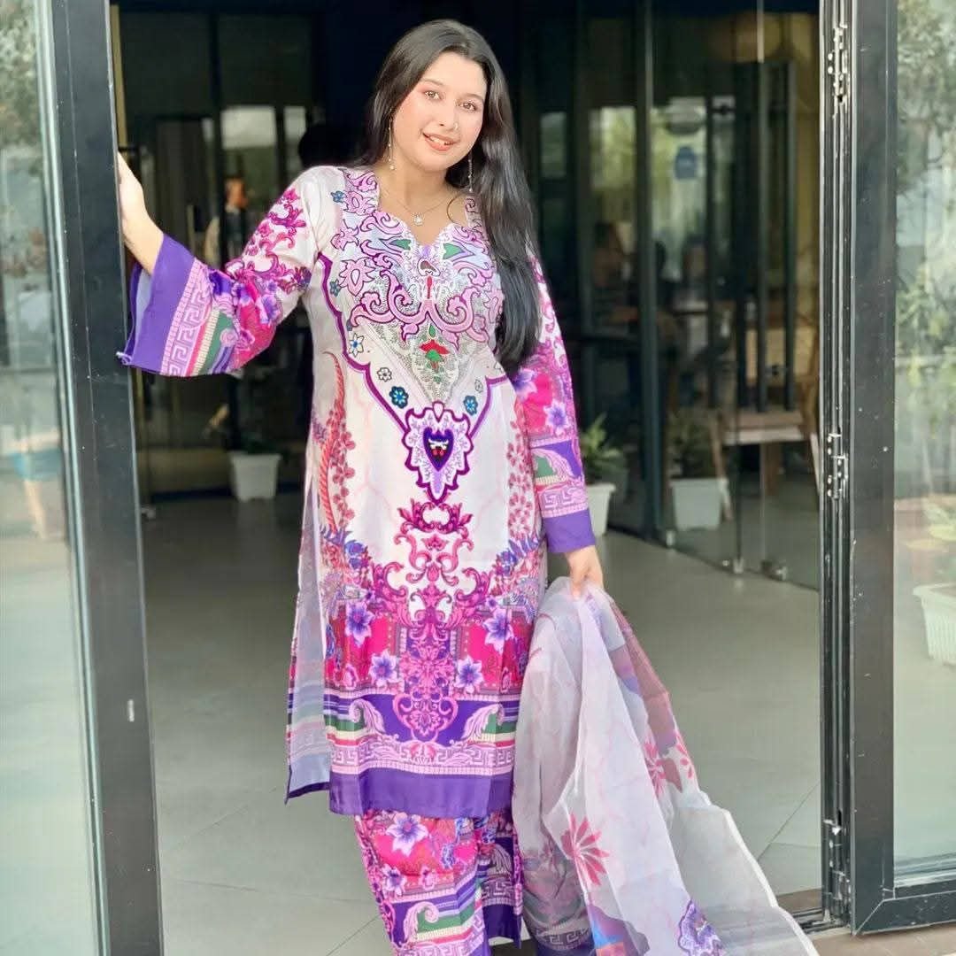 Elevate your ethnic wardrobe with this exquisite 3-piece set crafted from premium Dubai Silk and Georgette. Featuring vibrant digital prints, this set combines elegance and comfort, making it ideal for festive occasions, family gatherings, or casual outings. The harmonious blend of fabrics ensures a graceful silhouette while keeping you stylish and comfortable.